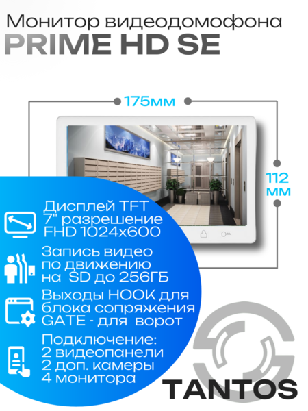 TANTOS Prime HD SE – изящный монитор в компактном исполнении. Поддерживает форматы AHD/CVI/TVI с разрешением 1080p/720p или CVBS (PAL/NTSC). Большой экран с диагональю 7”, управление осуществляется удобными сенсорными кнопками. Белый корпус отлично подойдет для большинства жилых и офисных помещений и впишется в интерьер. Монитор позволяет создать систему из 4 мониторов с полноценным адресным интеркомом (например, для осуществления общего или адресного вызов). Позволяет записывать фото и видео, в т.ч. по детектору движения и использовать будильник и календарьОсобенности