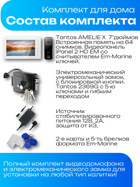 Комплект видеодомофона с вызывной панелью и электромеханическим замком - один из самых популярных на российском рынке. Он обладает современным дизайном, большим экраном диагональю 7”, управляется удобными сенсорными кнопками и позволяет осуществлять качественную голосовую и видеосвязь. Монитор имеет встроенный блок питания, что существенно упрощает подключение устройства. Монитор имеет встроенную память на 64 фото. Белый корпус отлично подойдет для большинства жилых и офисных помещений и впишется в интерьер. Вызывная панель антивандальная формата AHD 1080p (720p/CVBS (PAL)). В комплекте замок электромеханический, накладной, универсальный, с блокировкой кнопки, блок питания и гибкий переход.Стандартная четырех проводная схема подключения.Монитор Tantos Amelie X