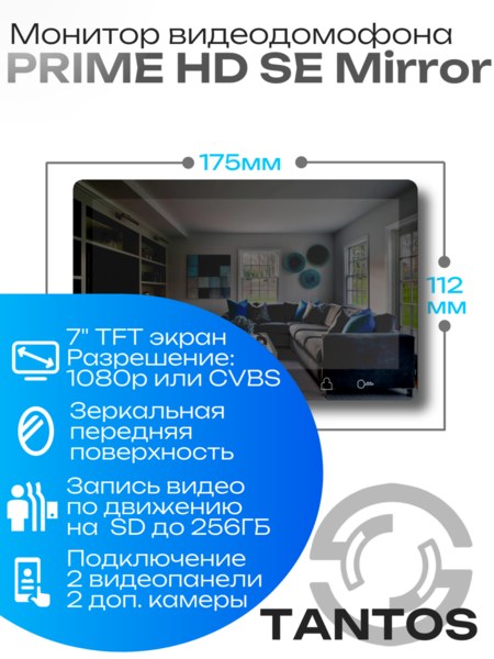TANTOS Prime HD SE (Black Mirror) изящный монитор в компактном исполнении с зеркальной передней поверхностью. Поддерживает форматы AHD/CVI/TVI с разрешением 1080p/720p или CVBS (PAL/NTSC). Большой экран с диагональю 7”, управление осуществляется удобными сенсорными кнопками. Черный корпус отлично подойдет для современных жилых и офисных интерьеров в стиле лофт. Монитор позволяет создать систему из 4 мониторов с полноценным адресным интеркомом (например, для осуществления общего или адресного вызов). Позволяет записывать фото и видео, в т.ч. по детектору движения и использовать будильник и календарь