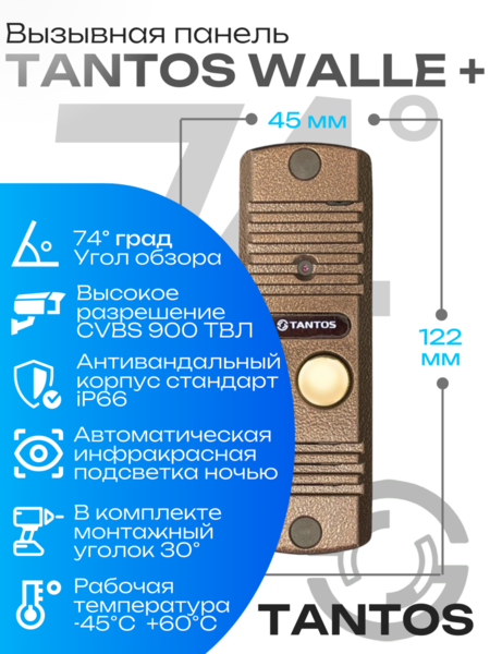 TANTOS WALLE+ (медь) – вызывная панель домофона с современным функционалом, выполненная в вандалоустойчивом металлическом корпусе под медь. В комплект поставки входят кронштейн для установки под углом (что очень удобно при размещении панели рядом с дверью), а также козырек для защиты от дождя. Камера с разрешением 900 ТВЛ обеспечивает высокое качество картинки. Имеет качественный звук, а также регулировку громкости динамика (под отвертку), что позволяет настроить звук в любых условиях использования панели. Вызывная панель WALLE+ также имеет встроенную ИК-подсветку, невидимую глазу человека. Предназначена для накладного монтажа, схема подключения – стандартная четырехпроводнаяСовместима с наиболее распространенными марками домофонов.