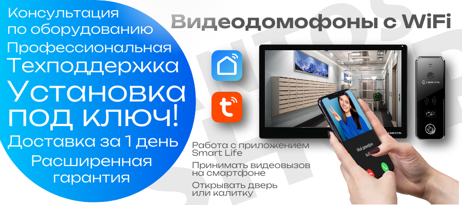Комплект WiFi видеодомофона с вызывной панелью со считывателем и электромеханическим замком 7” дюймов имеет возможность отправки уведомления в приложение Smart Life для ведения переговоров с посетителем и удаленного открывания замка.